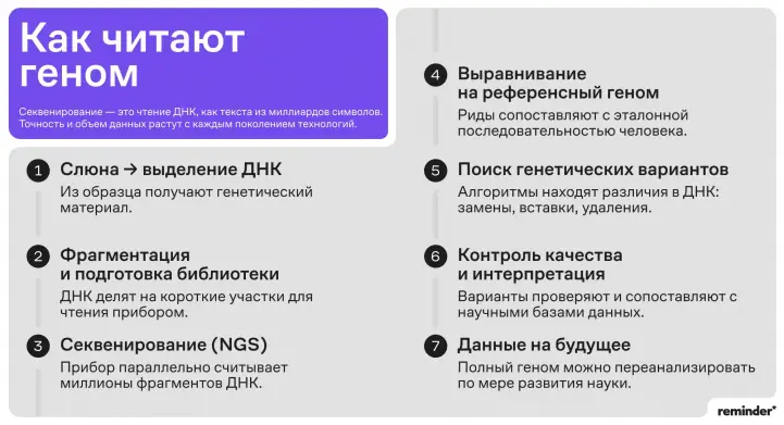 Полногеномное секвенирование — самый информативный тест ДНК на сегодняшний день. Есть и более простые исследования, в которых изучаются лишь отдельные фрагменты генома: например, когда нужно выявить генетическую предрасположенность к той или иной болезни. «Полногеномное секвенирование делается один раз в жизни, так как генетический материал в большинстве случаев одинаков в клетках организма и не меняется на протяжении жизни», — рассказывает Иван Михайлов.