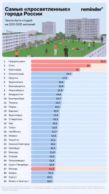 Верхние строчки рейтинга вопреки ожиданиям заняли города южных регионов и Черноморского побережья. Лидируют в этом списке Новороссийск, Сочи и Краснодар. В Новороссийске плотность студий достигает 35,5 на 100 000 жителей, что более чем в два раза превышает среднее значение по выборке.