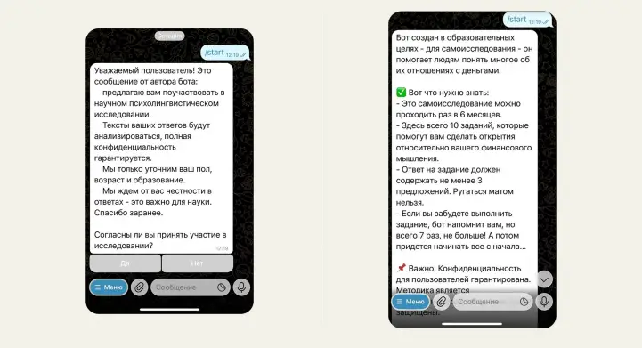 Для диссертации мне нужно было опросить как минимум 200 человек. Я решила обратиться к своей аудитории — у меня небольшие аккаунты в нескольких соцсетях. А чтобы людям было интересно и полезно проходить опрос, придумала исследовательского телеграм-бота, который бы работал по методу, близкому к коучингу и когнитивно-поведенческой терапии. Бот собирает рассказы людей об их первом финансовом опыте. Участники анализируют свои убеждения и получают инсайты, а я — исследовательскую базу. Этого бота я писала полгода по ночам. Уложу дочек спать — и сажусь за код. ChatGPT помог написать архитектуру бота и сам код. Основную часть я собирала с помощью Bolt и v0.dev. Конечно, приходилось многое проверять, перезапускать, исправлять ошибки. Этот проект я дописывала вечером 31 декабря.