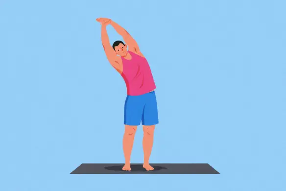 Встаньте, расставив ноги на ширине плеч. Вытяните руки вверх и обхватите правое запястье левой рукой. На выдохе медленно наклонитесь влево, растягивая бок. На вдохе вернитесь в исходное положение и поменяйте сторону. Повторите упражнение 3–5 раз, следите за дыханием.