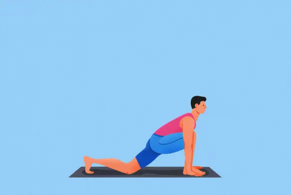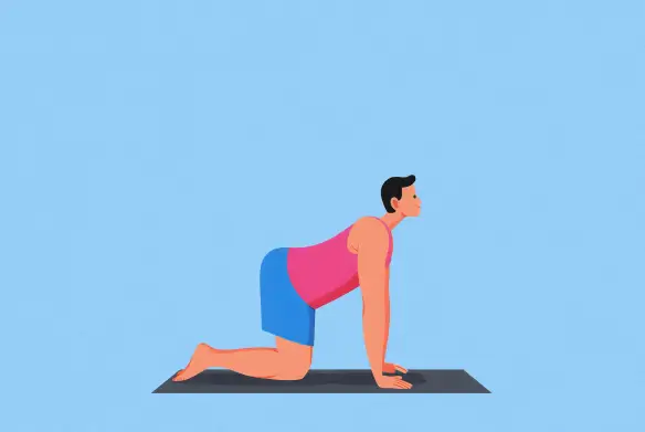 Встаньте на четвереньки: запястья под плечами, колени под тазобедренными костями. На вдохе прогнитесь, раскрывая грудь. На выдохе округлите спину, подтягивая живот. Повторите пять раз в спокойном темпе.