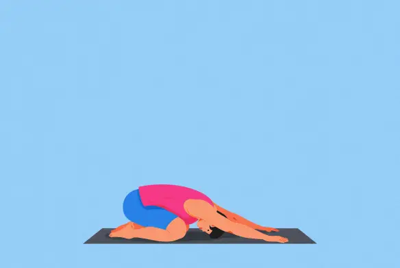 Встаньте на колени и опуститесь тазом на пятки. Соедините большие пальцы ног, а колени слегка разведите в стороны — так будет комфортнее. Медленно наклонитесь вперед, положив корпус на бедра. Лоб опустите на коврик или на подушку. Руки вытяните вперед или положите вдоль тела. Оставайтесь в позе 5–10 спокойных циклов дыхания (цикл дыхания — это вдох и выдох).