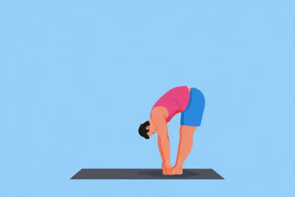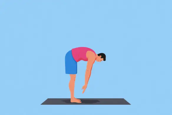Встаньте прямо, опустите подбородок к груди и начните постепенно наклоняться вниз, позвонок за позвонком. В нижней точке расслабьте голову и руки, позволяя телу свободно повиснуть. Задержитесь в этом положении на некоторое время.