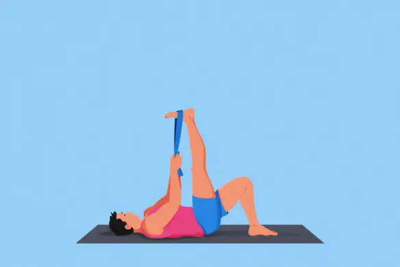 Лягте на спину. Одну ногу согните и поставьте стопой на пол. Другую ногу подтяните к груди, наденьте ремень или резинку на стопу и, удерживая концы в руках, медленно выпрямляйте эту ногу вверх. Колено можно оставить слегка согнутым — важно, чтобы растяжение было комфортным. Задержитесь в позе на 5–10 спокойных циклов дыхания, затем медленно опустите ногу и поменяйте сторону.