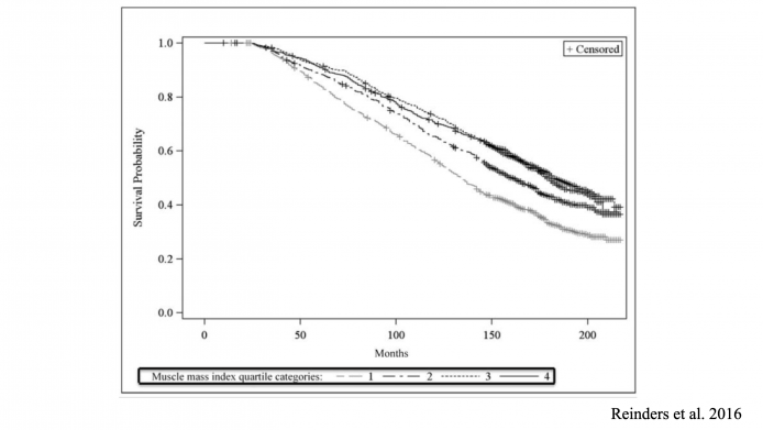 Со временем — см. нижнюю шкалу, где отложены месяцы — люди уходили из жизни, вероятность выжить снижалась. Конечно, во всех группах люди умирали, но самая нижняя группа уходила из жизни быстрее. Вероятность выжить у них становилась меньше и меньше. Вывод? Хорошо быть в верхней половине (группы 3 и 4) по мышечной массе.